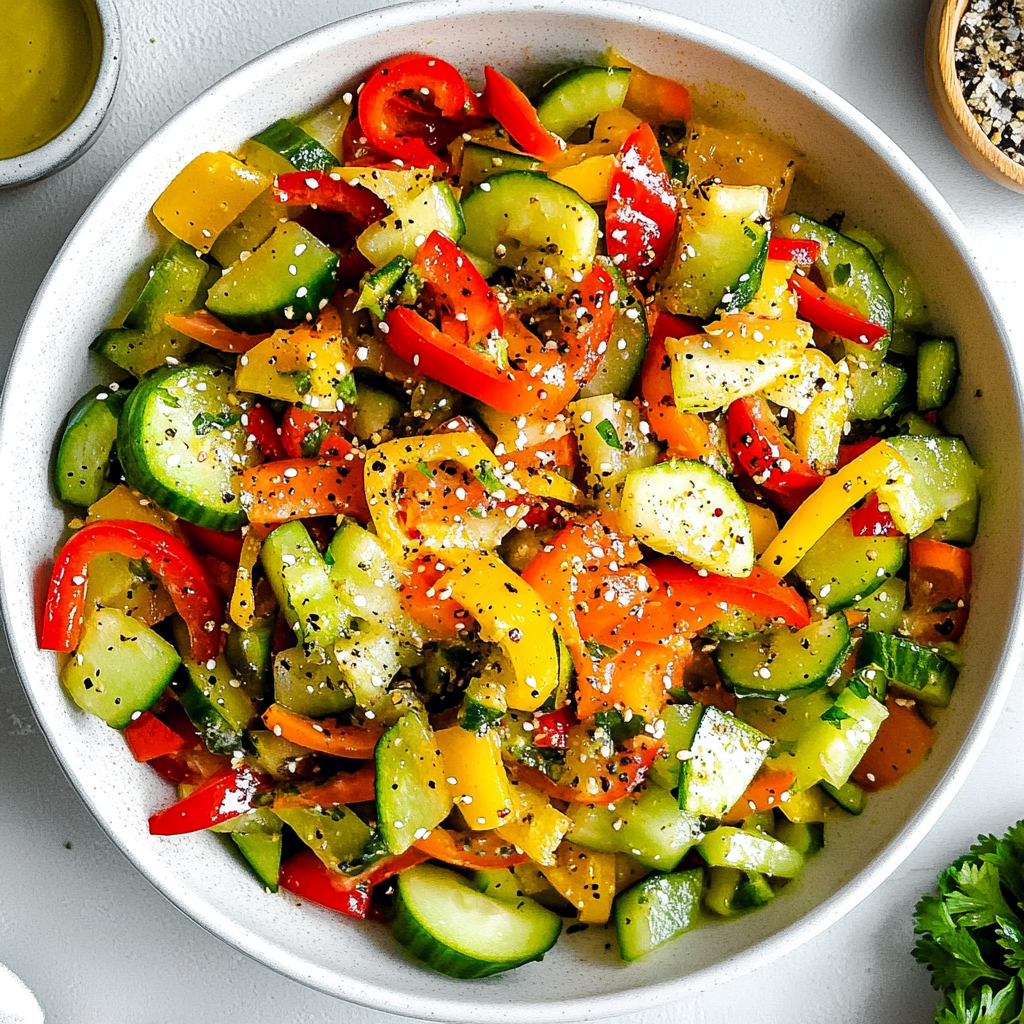 Savour our crisp Cucumber and Sweet Pepper Salad. A refreshing blend of fresh flavours, perfect for a light lunch or a vibrant side dish. This salad is not only easy to prepare but also bursting with color and crunch, making it an instant hit at any gathering. Let’s dive into how you can whip up this delightful dish!